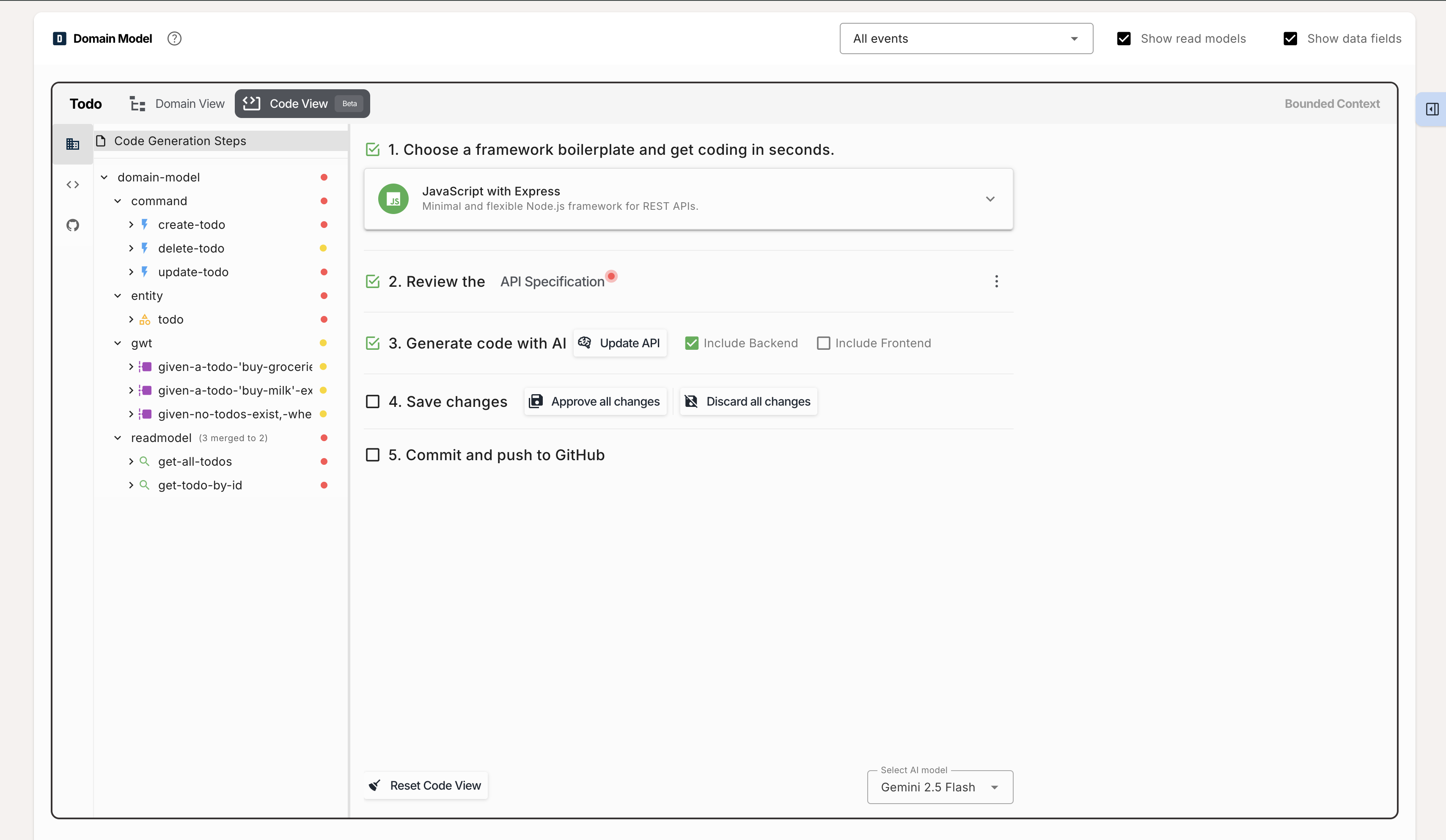 After creating your Domain Model, open the Code View for the Bounded Context you wish to work on. Here, you'll find the main code generation interface.